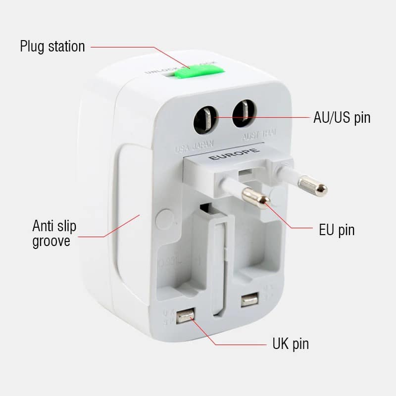 El Adaptador Internacional de Enchufe funciona en más de 150 países con US/EU/UK/AU y soporta voltajes de 100-250V.
