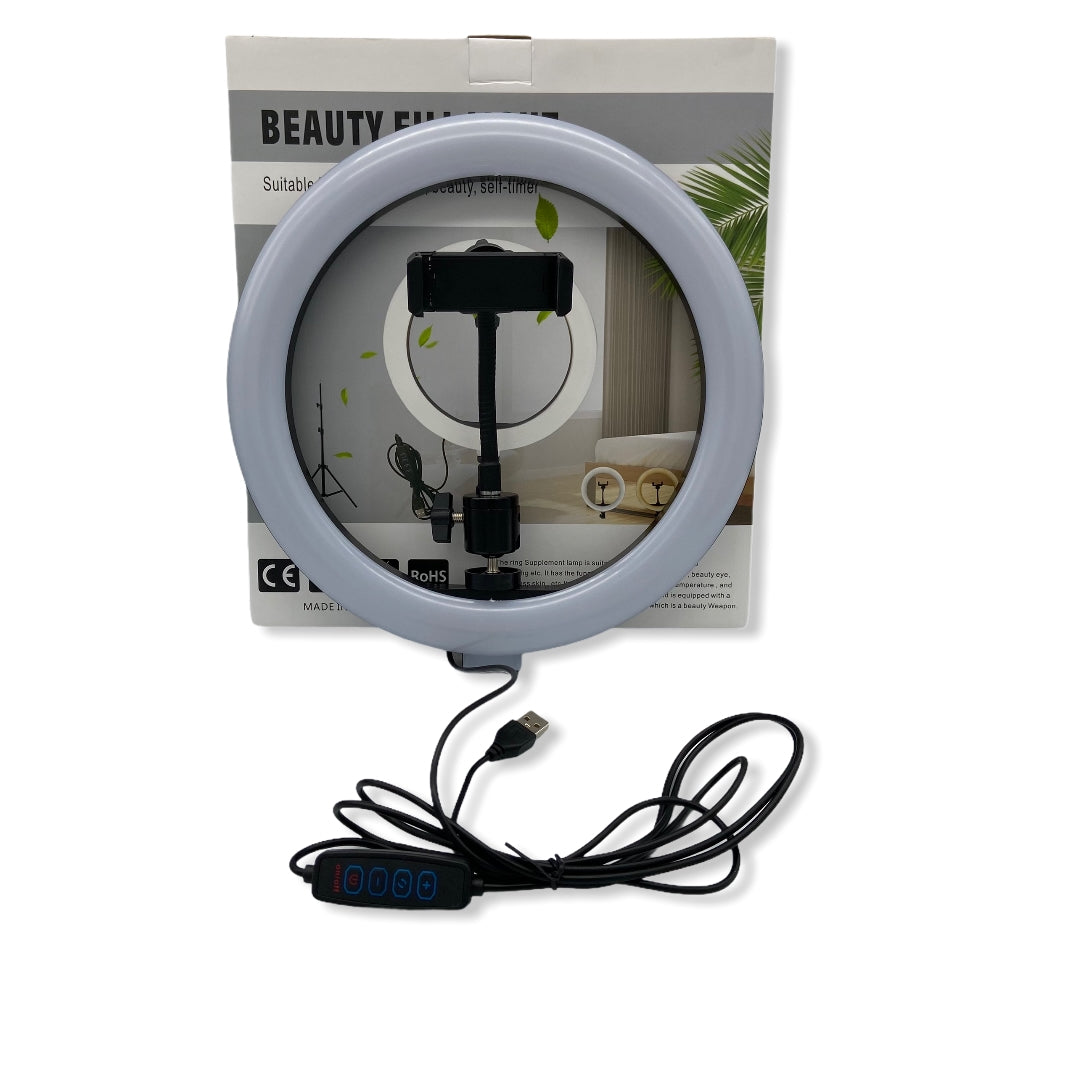✨ Aro de luz de 26 cm con tres tonos de luz (cálida, blanca y natural), control de intensidad y Bluetooth para manejarlo fácilmente desde tu celular.
