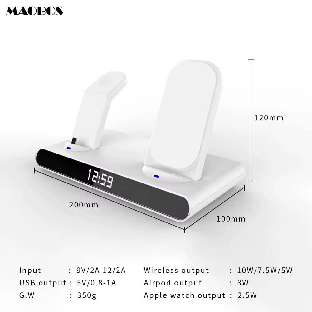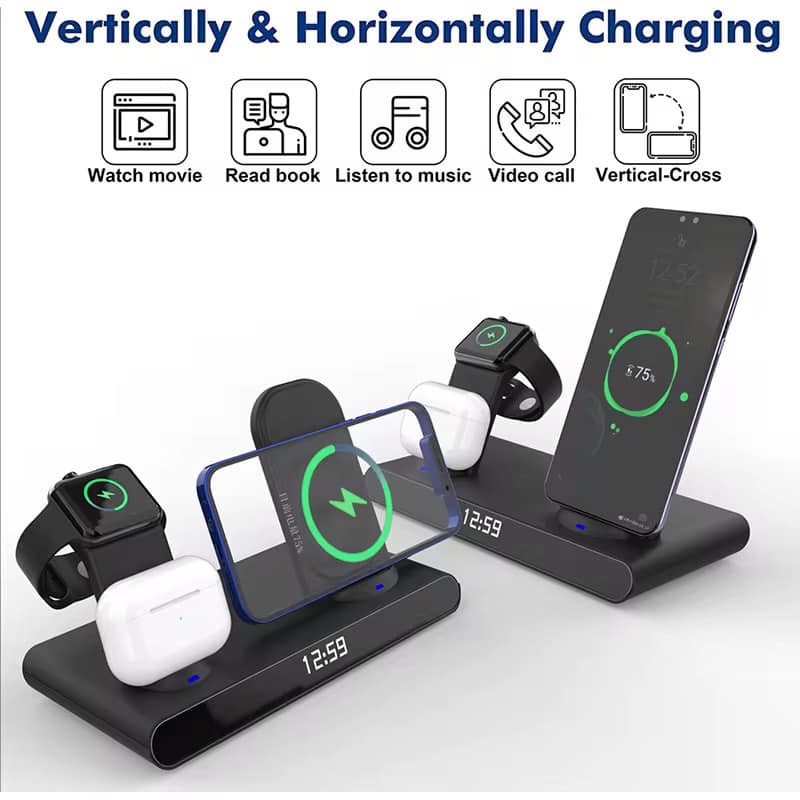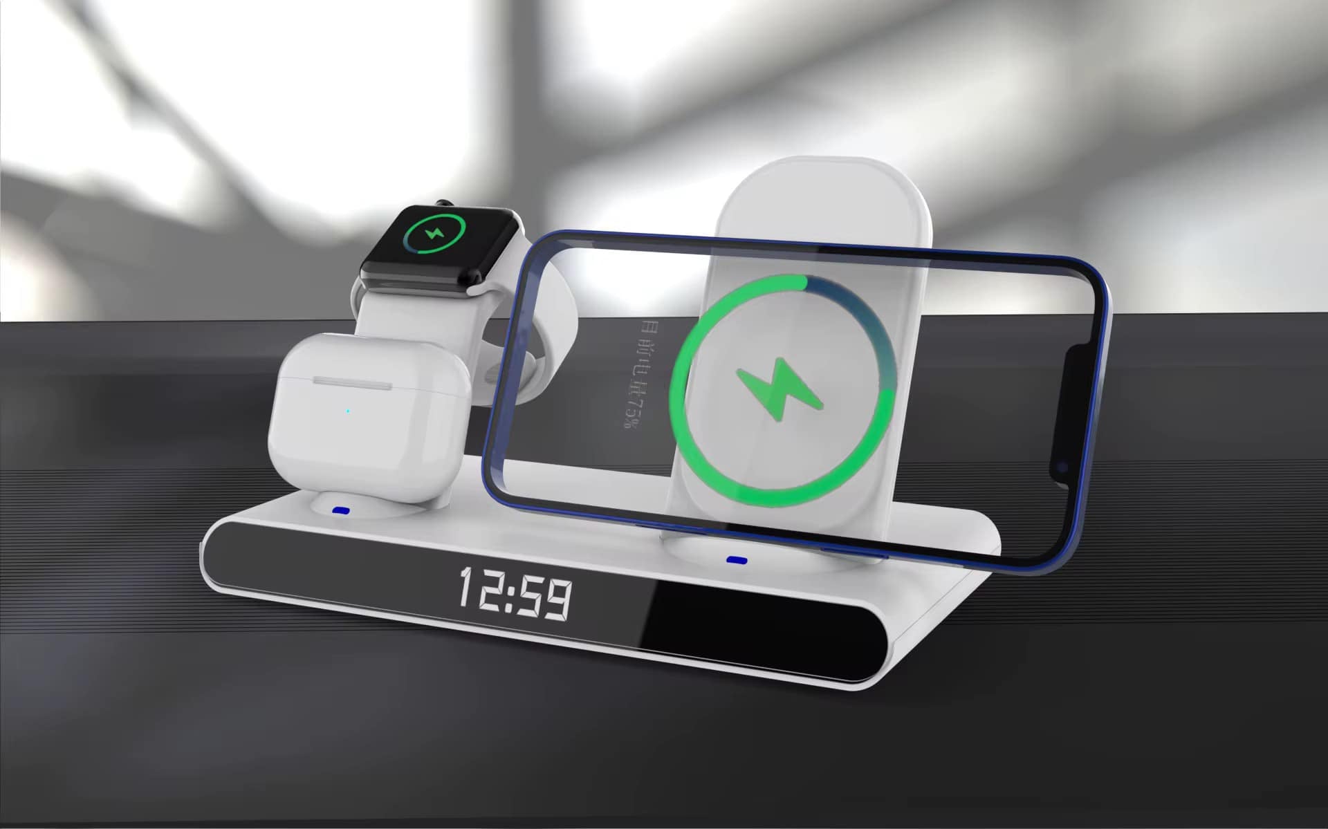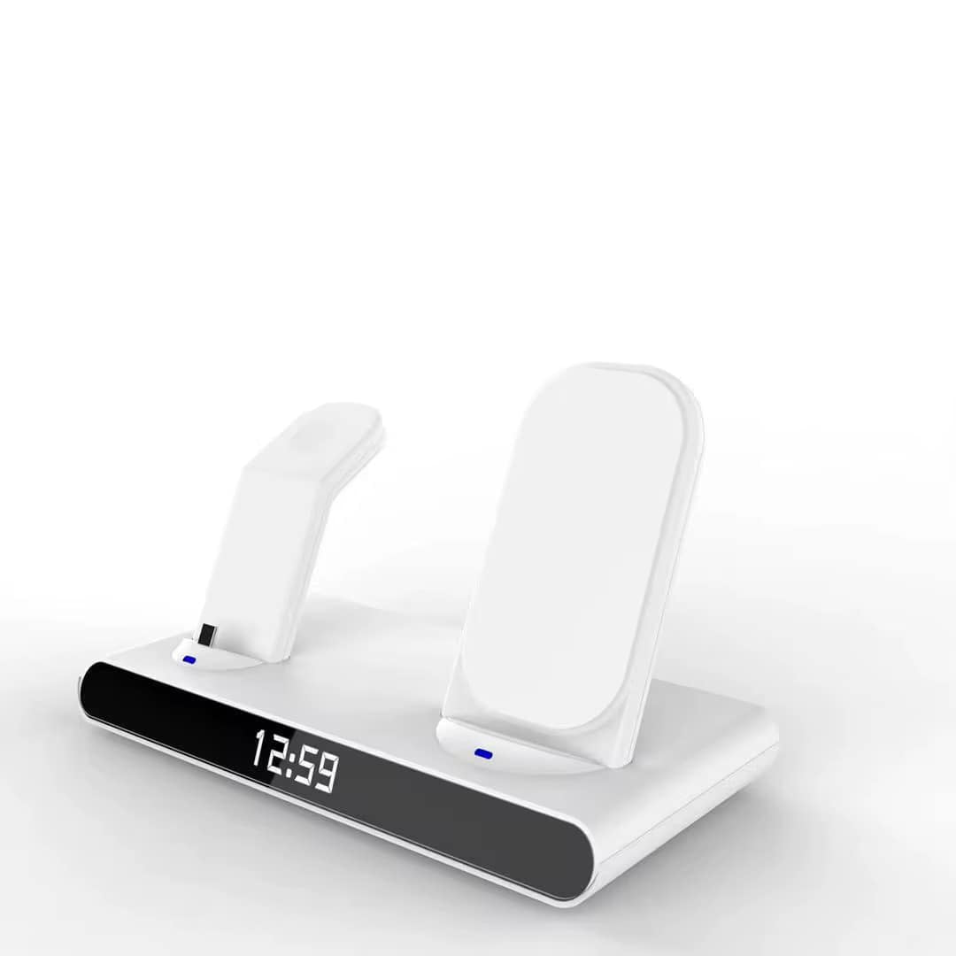 El Cargador Inalámbrico Plegable 5 en 1 incluye reloj despertador, alarma y soporta carga rápida de 15W para teléfonos, auriculares y relojes inteligentes.