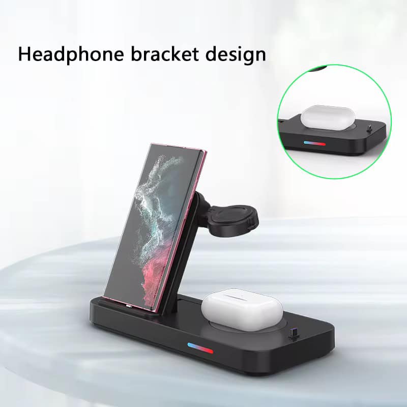 El Cargador Inalámbrico Plegable 4 en 1 B-19 soporta carga rápida de 15W para teléfonos, auriculares y relojes inteligentes.